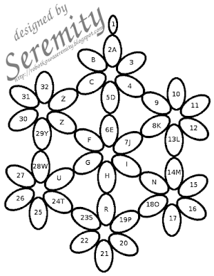 4. Kółeczko N (a potem R, U, Z i Ź) wykonujemy analogicznie do kółeczka 9, tylko używając II czółenka i nawlekając koralik z kółeczka I (a potem odpowiednio H, G, F i C) po obróceniu robótki. Przed drugim nawinięciem nitki na czółenko II w trakcie wykonywania każdego z tych kółeczek poza ostatnim, należy jeszcze dodatkowo na nitkę nawlec 1 koralik (czyli na tej nitce najpierw jest koralik z płatka ze środkowego kwiatka, a potem dodatkowy koralik).